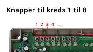 Find knappen der passer til den kreds du vil parre med en termostat. Knapperne går fra kreds 1 til 8, fra venstre side. Se billede forneden.