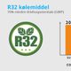 - R32 kølemiddel, som kun er 30% så miljøbelastende som det hyppigt anvendte R410A kølemiddel.
